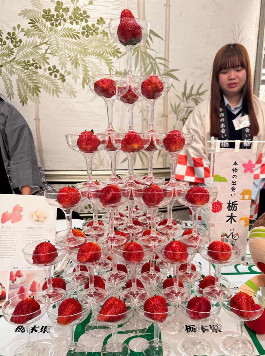 福島県のブースでは、芳醇な香りの日本酒と「くだもの王国」らしい桃ジュースが人気を博し、栃木県からはハート形のいちご「とちあいか」や老舗の銘酒「開華」が並びました。兵庫県のブースでは、純米大吟醸「大褒寿」や「小鼓」など、香り高い地酒が注がれたほか、梅酒や六甲山ウイスキーの試飲もあり、多くのゲストがグラスを傾けました。