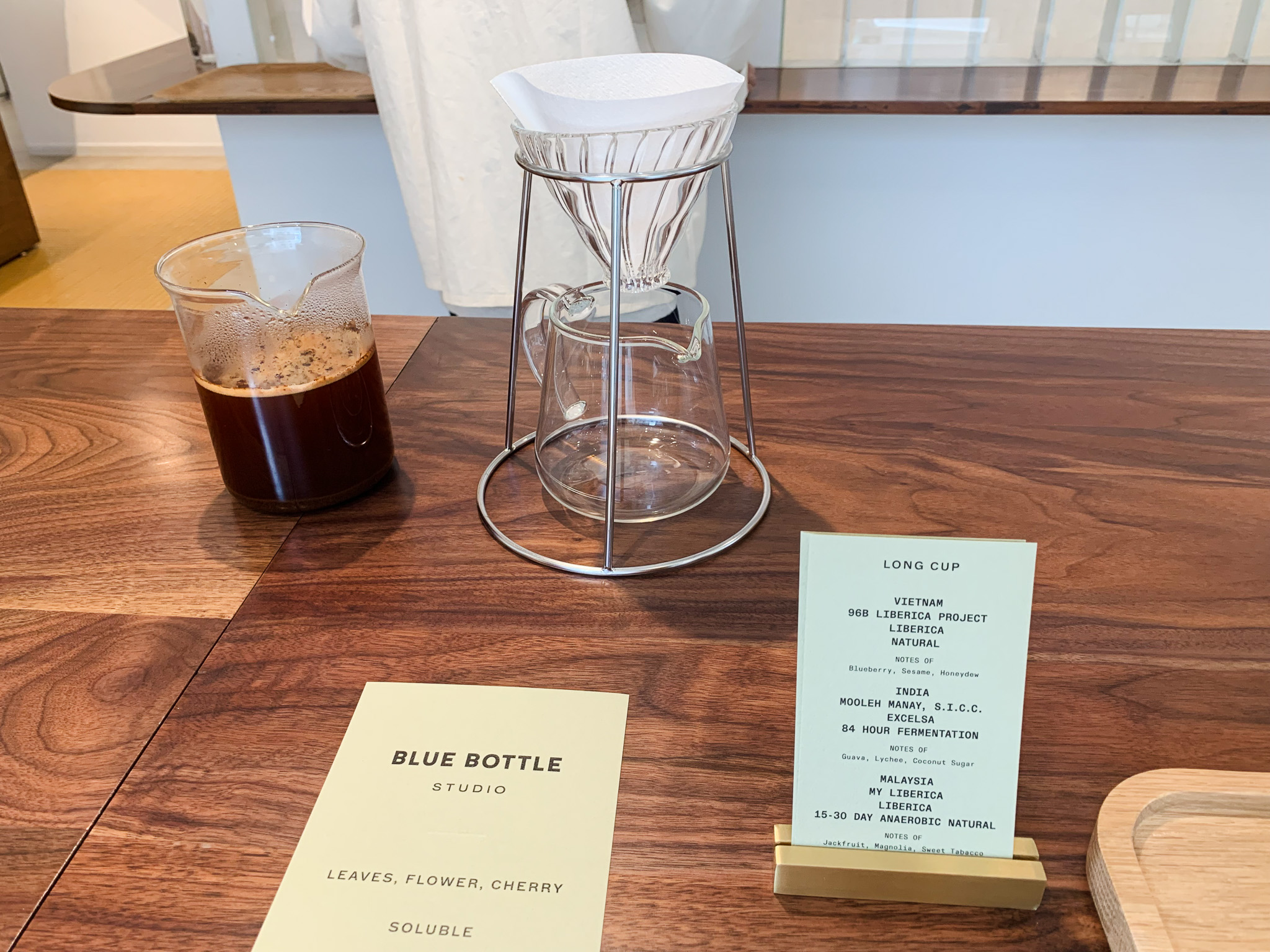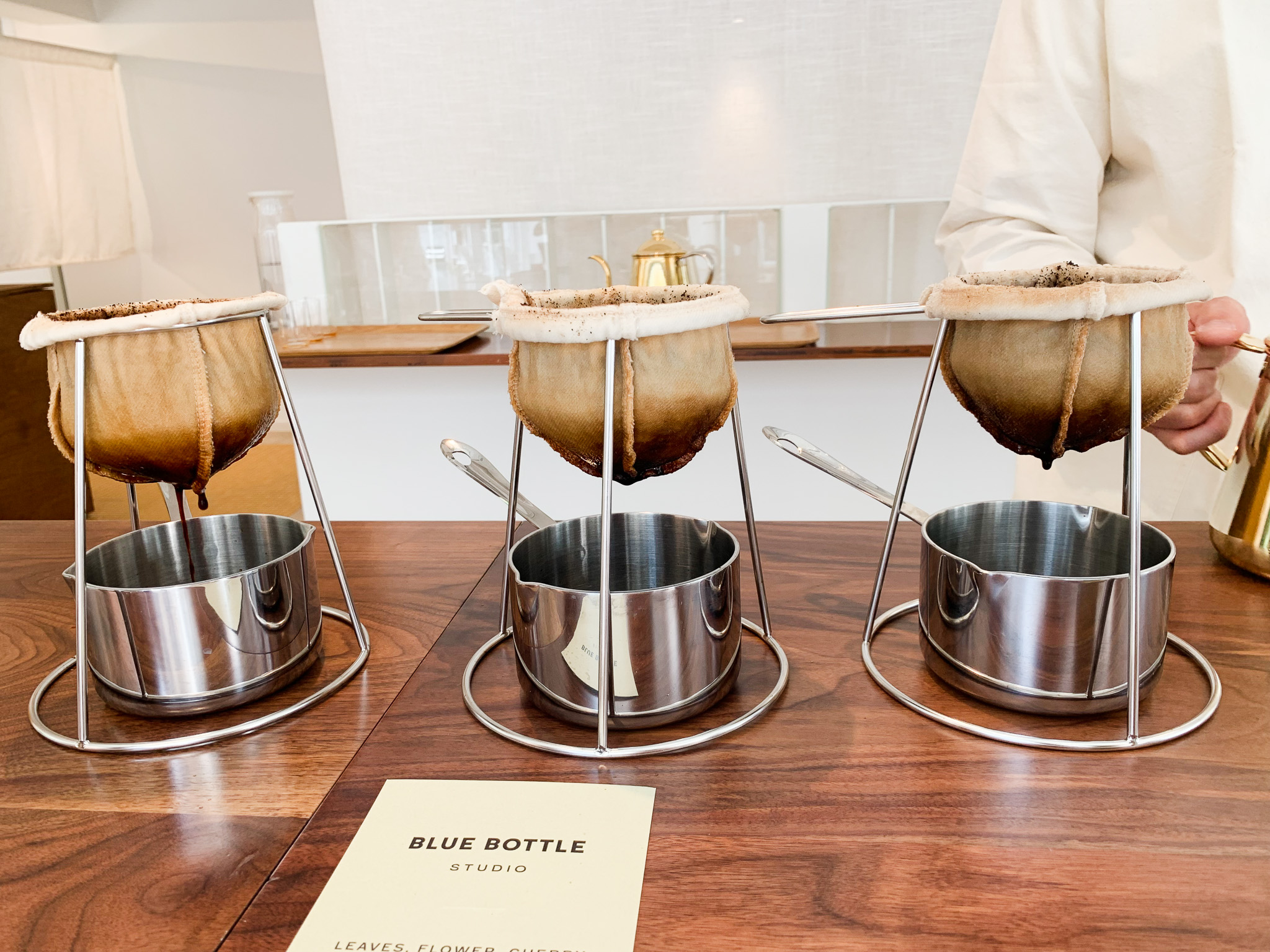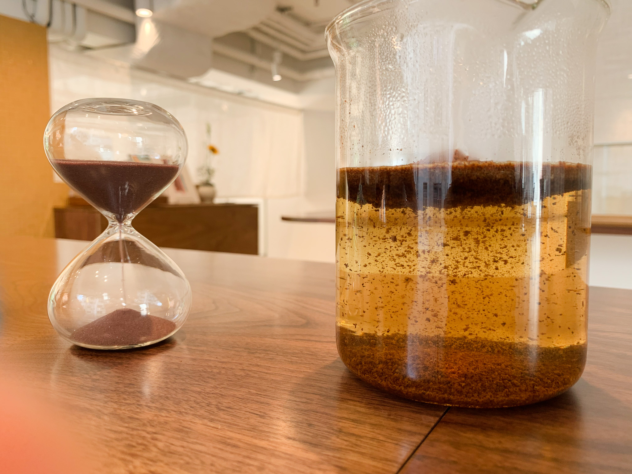 3つ目のロングカップは、その名の通り、長い時間をかけて抽出するコーヒーを言います。お湯にコーヒーの粉をサラサラと回し入れて、粒が静かに底に落ちていくのを眺めながら待ちます。横に置かれた4分砂時計。一気にメディテーションのような癒し時間になりました。これこそが、Blue Bottle Coffeeの言うコーヒーの体験なのでしょう。あー、今日はここに来れて良かったなと思った瞬間でもありました。