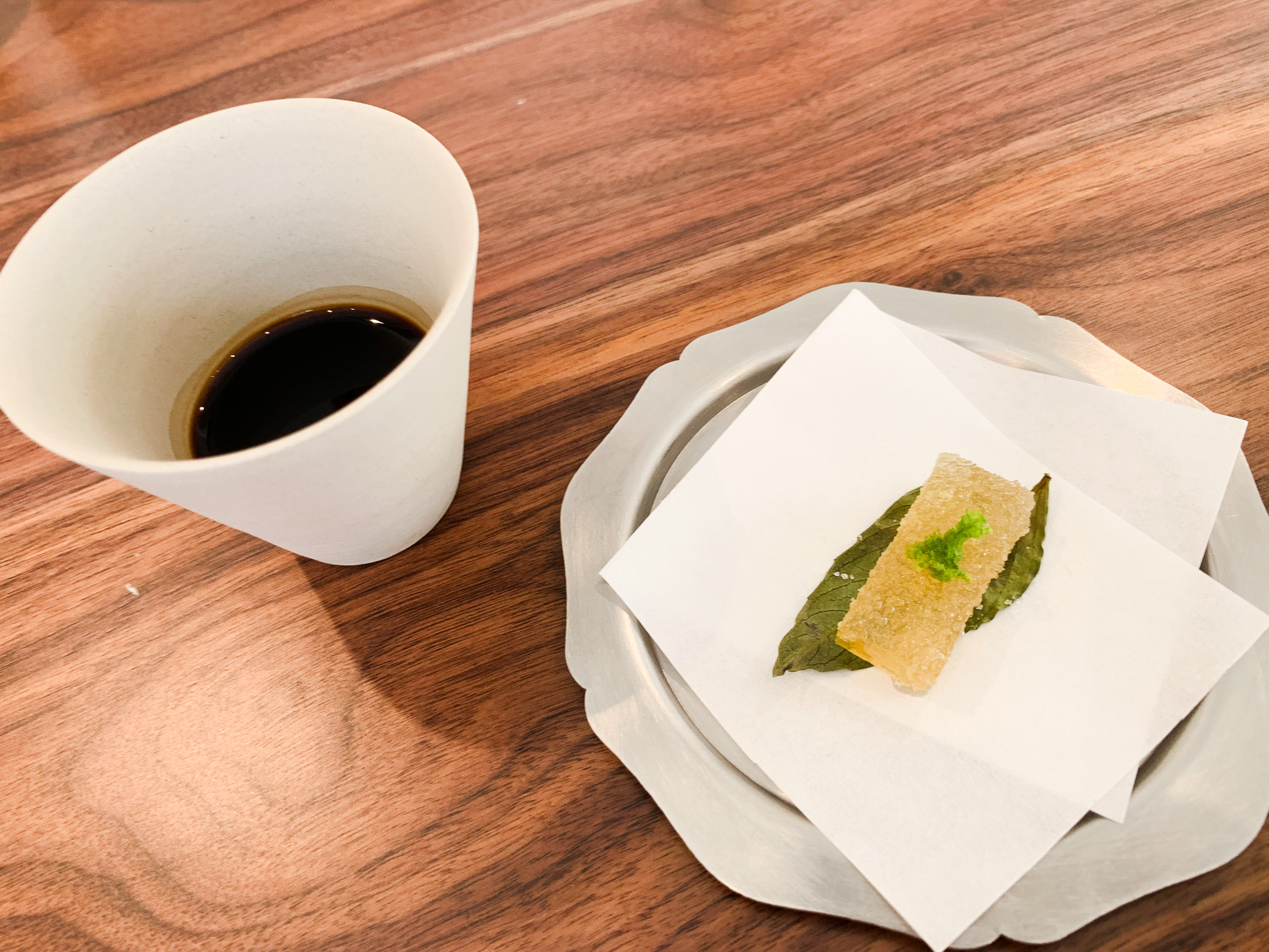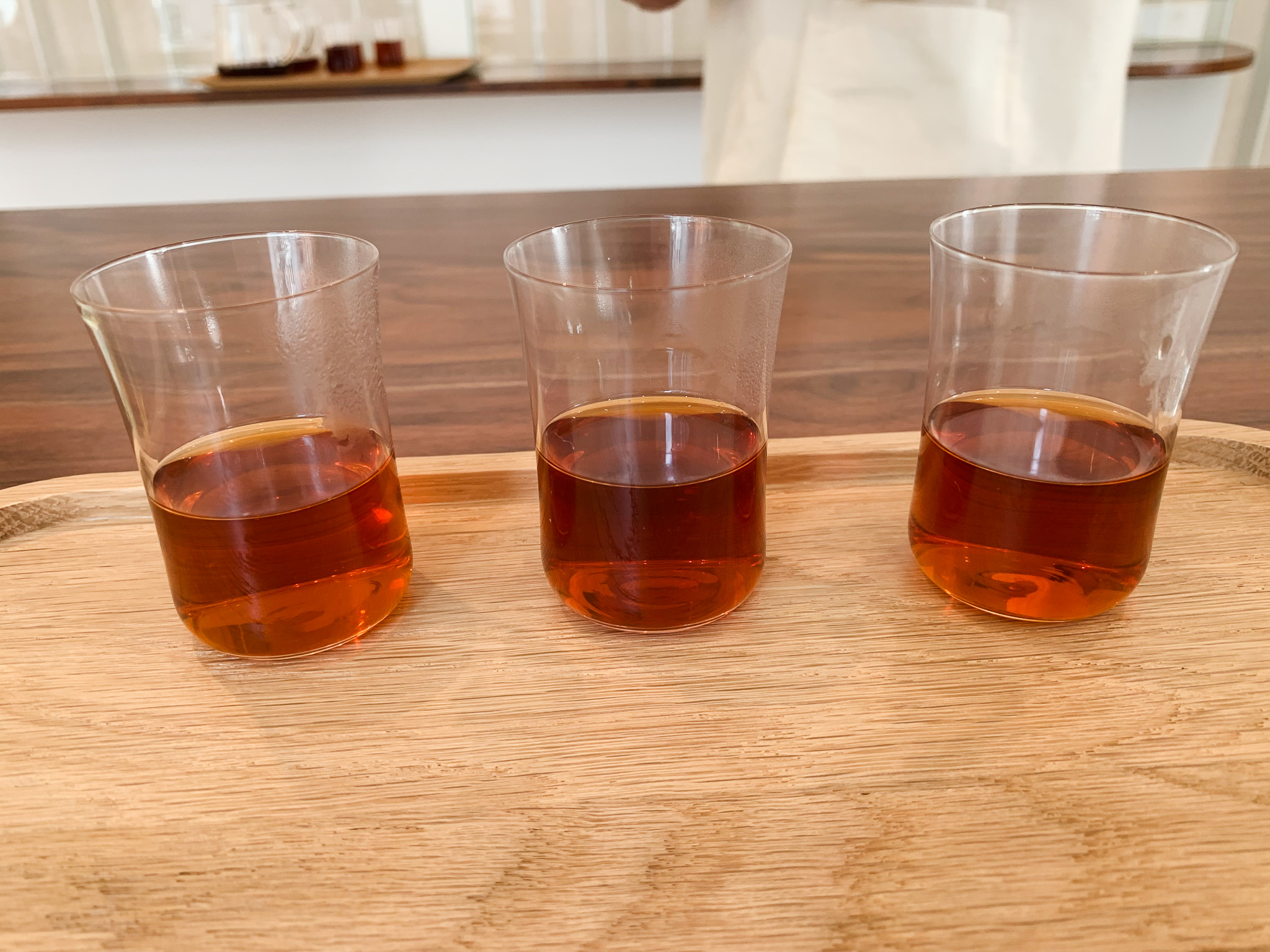 さて、読者の中で、コーヒーの葉、花、実を使って淹れたお茶を飲んだ方はいるでしょうか? 筆者にとっては生まれて初めていただくものばかりなので、胸が高鳴ります。3種類の部分を使ったお茶でそれぞれが素晴らしかったのですが、中でも花のお茶は本当に素晴らしかったです。最初にパッとフローラルな香りがします。どちらかというと桂花烏龍茶を連想させるような華やかな香りですが、それよりももっと繊細でうっとりします。また、実で淹れたお茶は、実だけでは酸っぱいので和三盆を少量混ぜています。ほんのり甘くて少し酸味があってかすかにコーヒーの香りもしました。