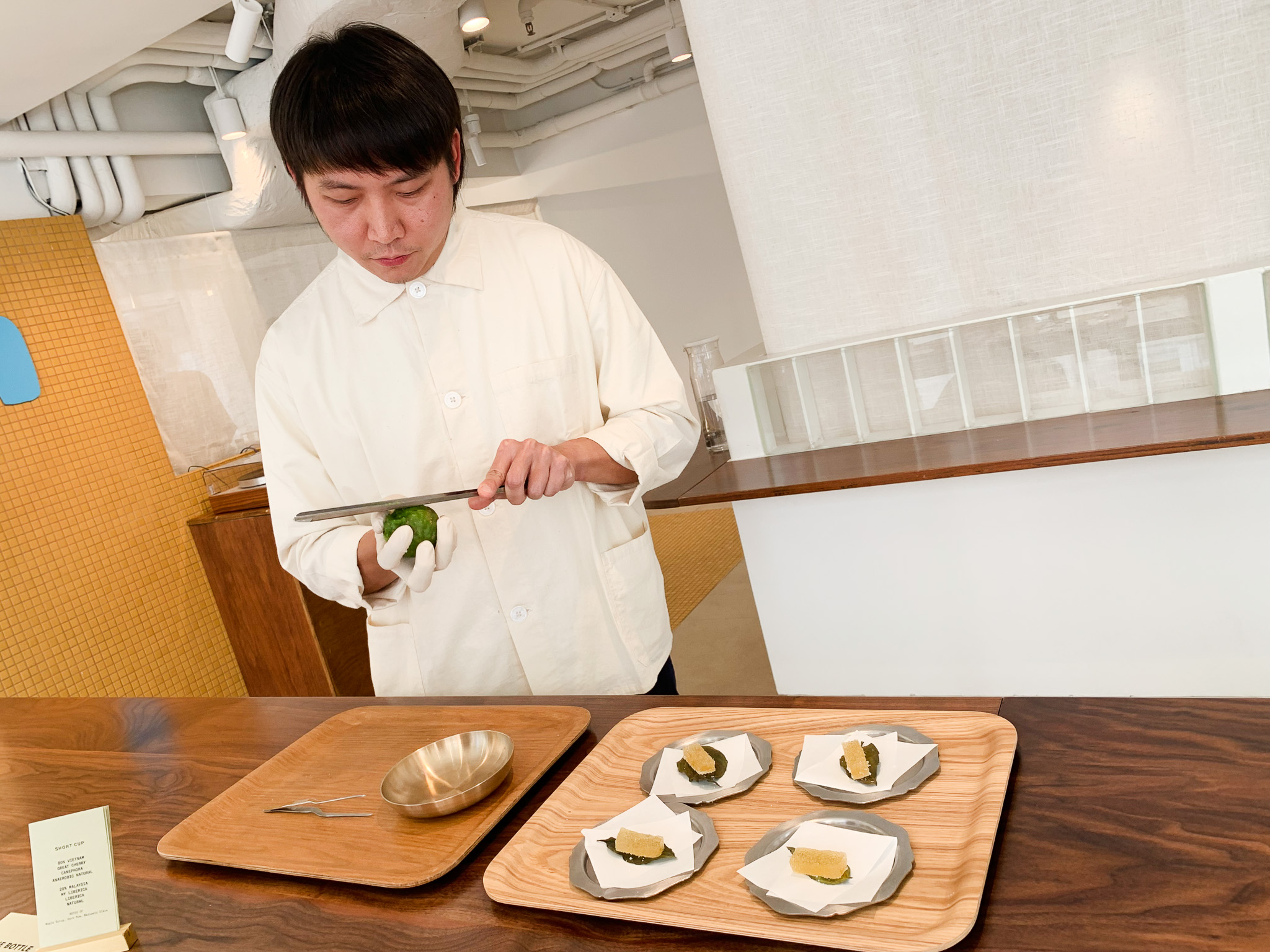 コーヒーが淹れられるのを待っている間、バリスタが菓子の「琥珀」を用意してくれます。パイナップルゼリーのようなお菓子で見た目も綺麗。この上に緑のトッピングを乗せるために、柑橘系のフルーツの皮を削り取ります。するとその傍らから、通常のレモンの何倍も爽やかな香りが立ち込めてきて、嗅いだ瞬間にふわっと体が軽くなりました。花の香りにレモンが混ざったような香りです。これは台湾産の楕円形をした緑色のレモンで、その名も「香水檸檬」というのだそうです。香港では街市でも売っているので簡単に手に入るそうです。これをトッピングしていただきます。