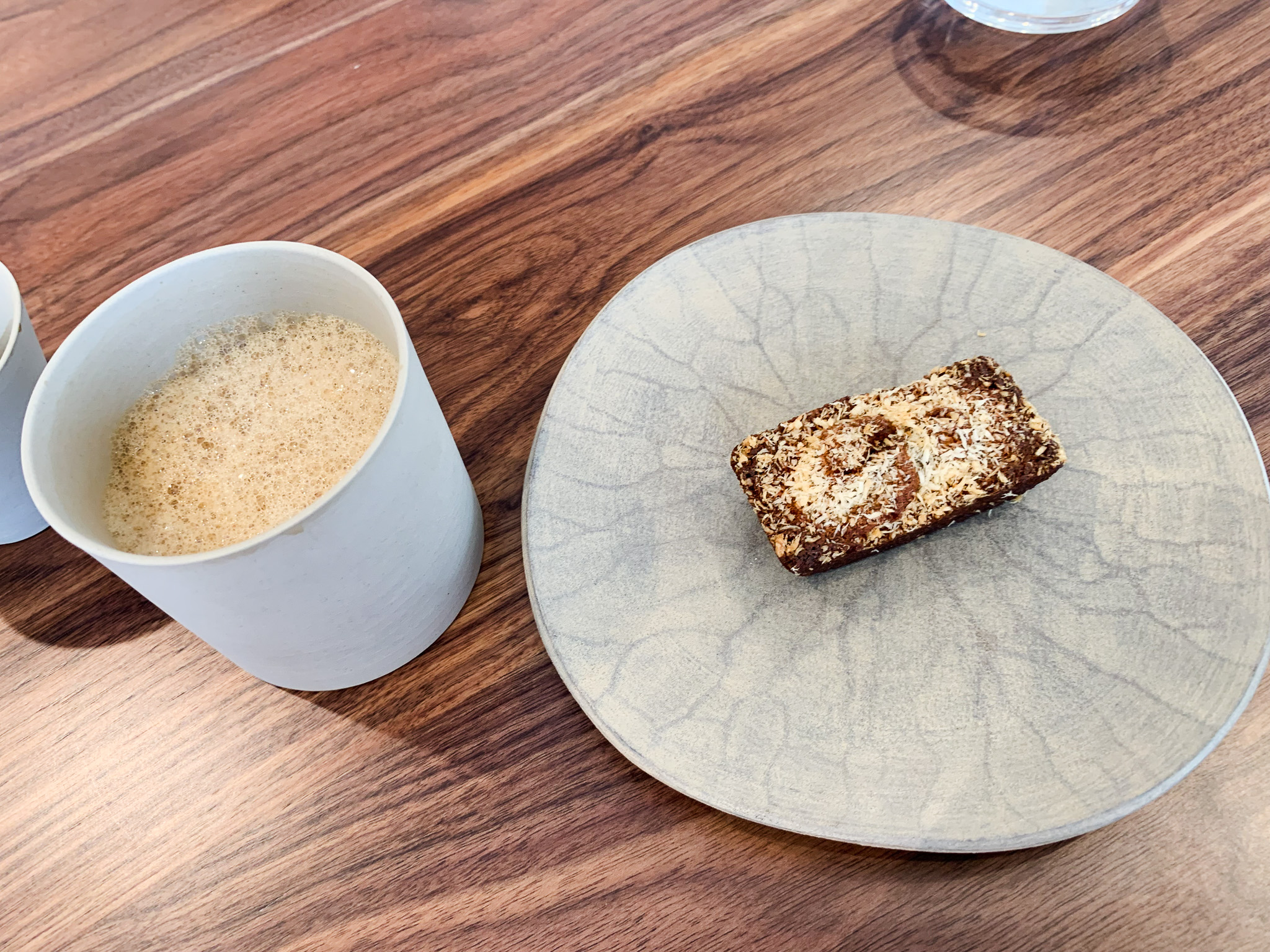 5つ目は、先ほどのショートカップを使ってカフェオレにアレンジ。焼き菓子も一緒にいただきます。カフェオレは牛乳かオートミルクかを選べます。ここまででコーヒーを散々飲んだにも関わらず、カフェオレにするとまた全部飲めてしまいます。こんなにゆったりとコーヒーに向き合い、味わえる特別な時間を持てて、心の余裕の大切さを感じられる時間になりました。