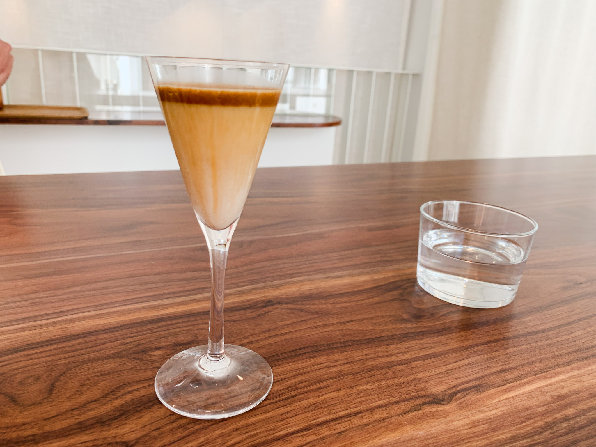 そして締めの食後酒は、香港製造のN.I.P Rare Dry Ginを使ったコーヒーと牛乳(オートミルク)カクテル。ジンは人によっては独特な香りが苦手な人もいるかもしれませんが、これはジンなのか? と思うほど、松のようなウッディな香りというよりも、フローラルで爽やかな香りです。二層になったコーヒーとミルクが絶妙にマッチして、グラスを回しながら飲むと爽やかさとスパイスが複雑に絡み合い、濃厚で奥深い味わいを楽しめます。今回初めての冷たいドリンクで、とても新鮮で、すっきりと終了できました。