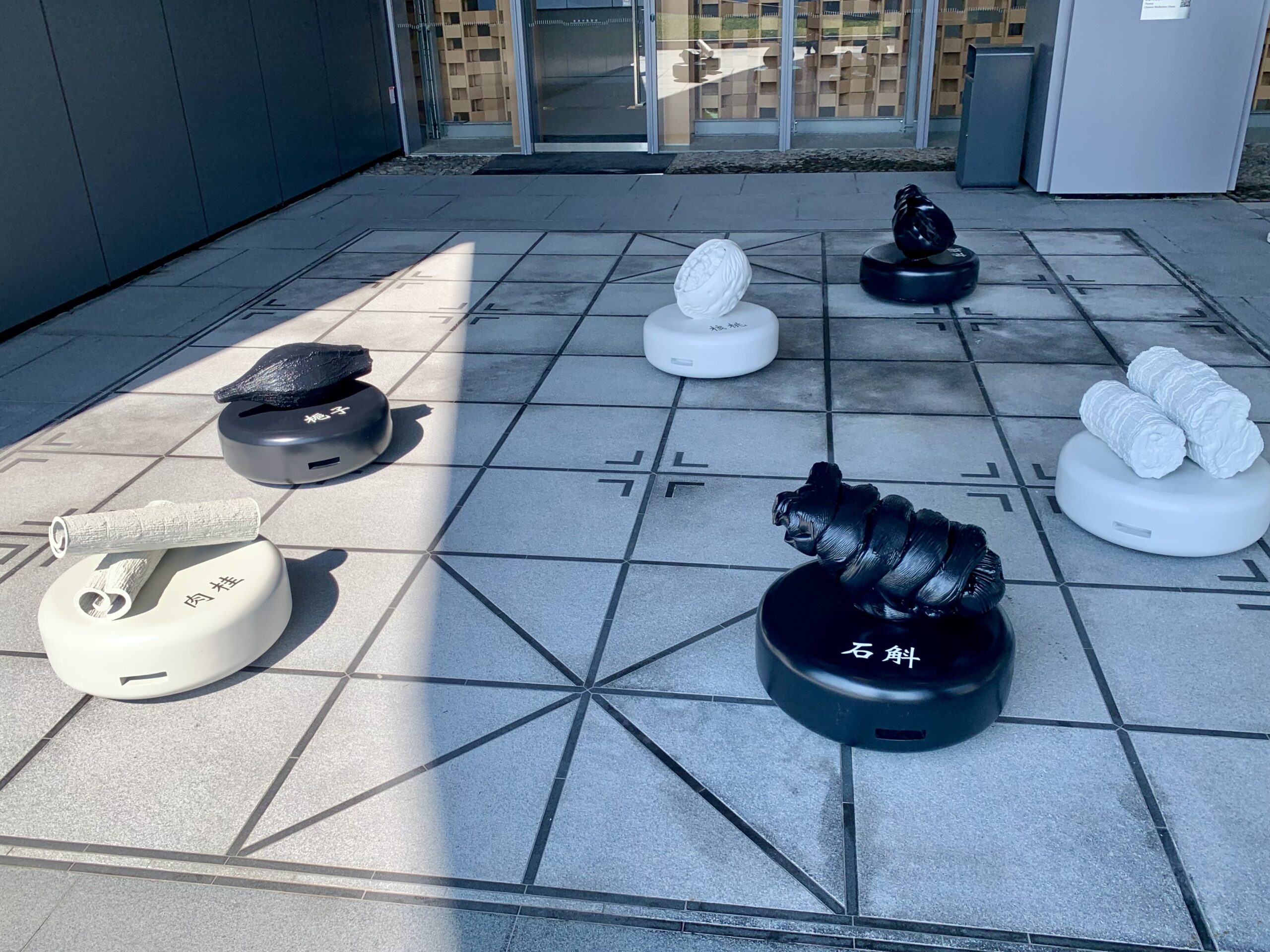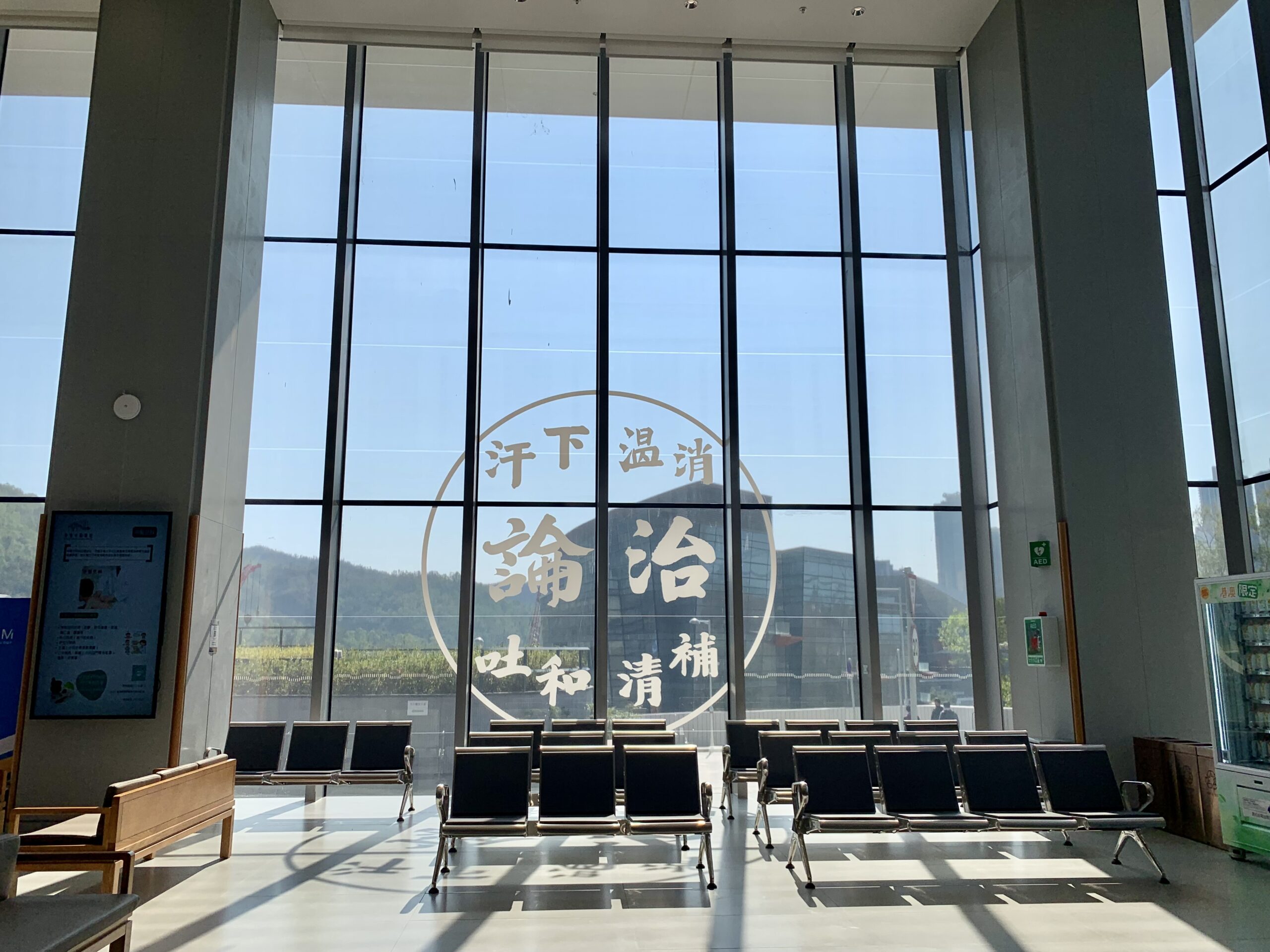 全体的に院内は天井も高く大きな窓に囲まれ、光がふんだんに取り入れられています。ここ薬局の待合所の窓には大きな文字がありました。これは中医学で治療における基本的な考え方を簡潔に説明したものです。