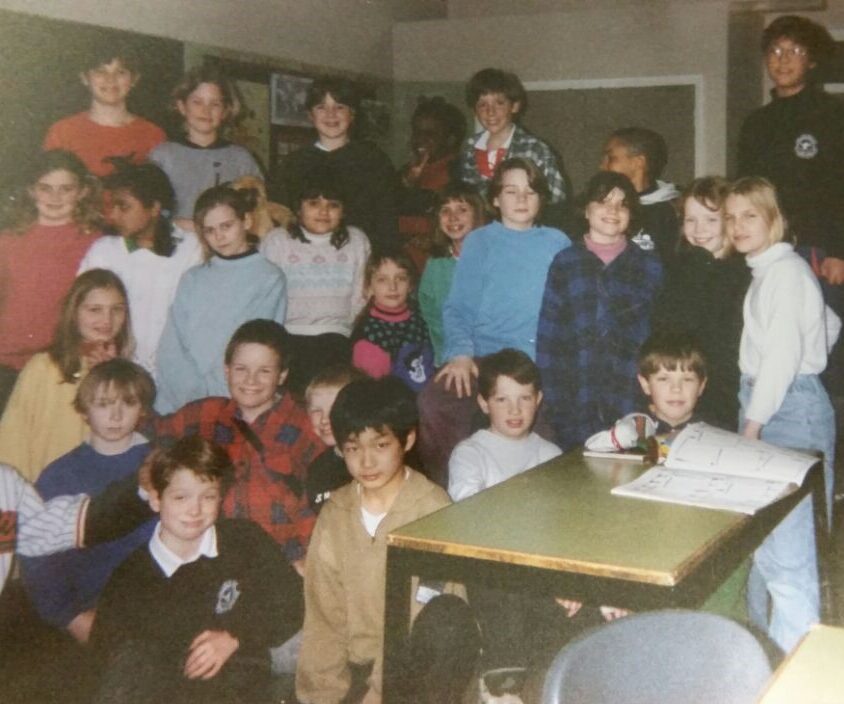 オックスフォードでの小学生時代。前列中央にいる江上さん。運動でも人気者になったが、折り紙でもみんなに喜ばれたという。