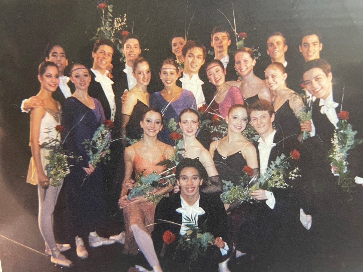 英国ロイヤル・バレエ学校時代、公演後のグループ写真。後列中央付近にいるのが江上さん。