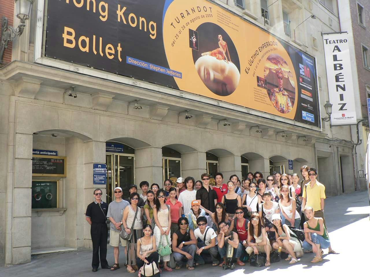 入団3年目の2005年、香港バレエ団のスペインツアー。劇場の前で集合写真。前列中央でしゃがんでいる江上さん。