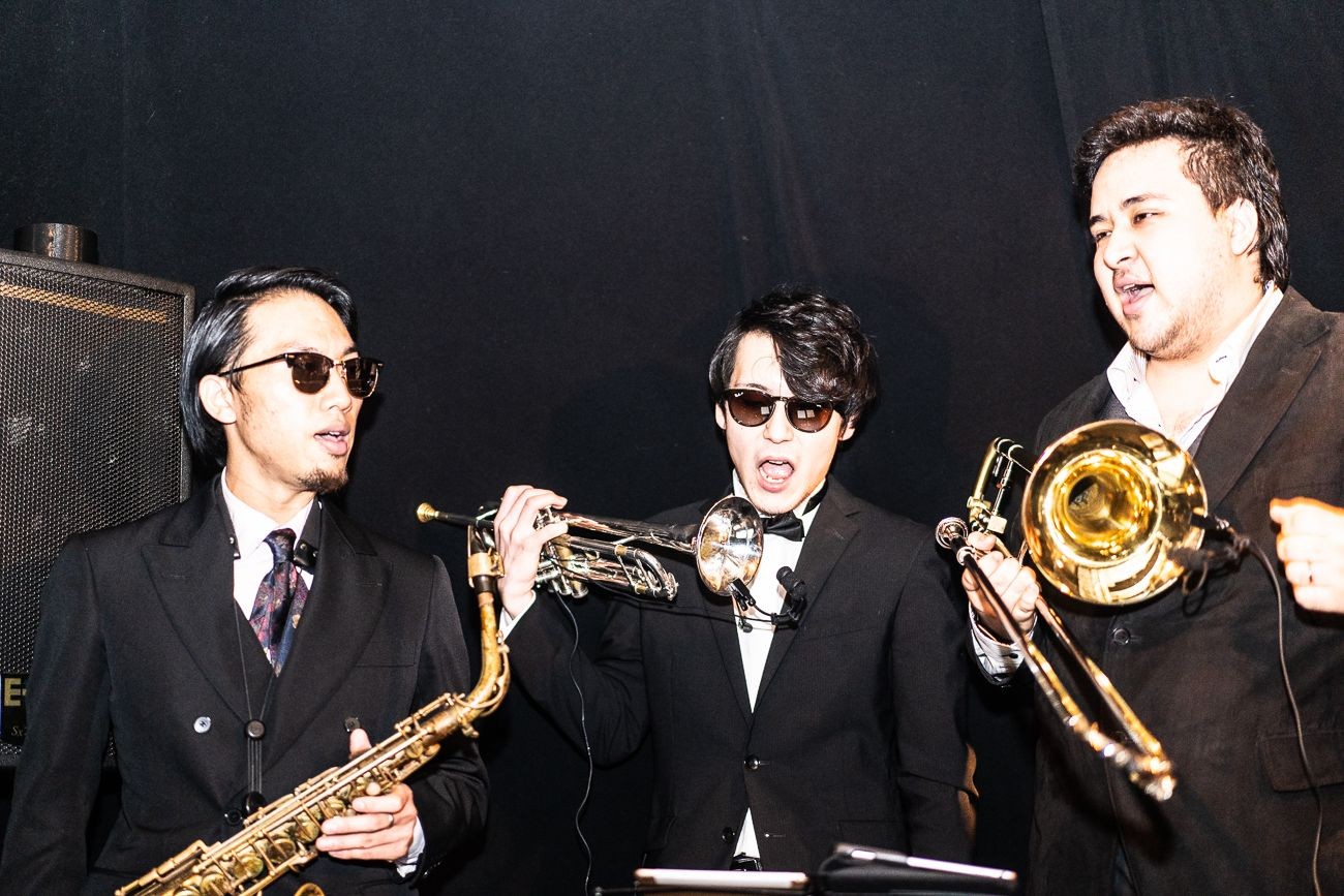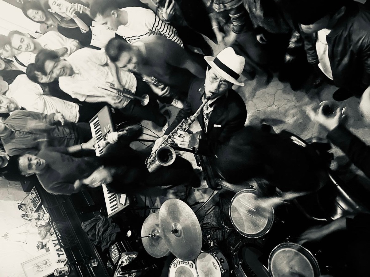 ステージでリーダーを務めるのは、トレードマークであるパナマハット姿のYHUさん。彼のサクソフォーンが力強く低音から高音へ駆け上がると、客はその音に酔いしれる。