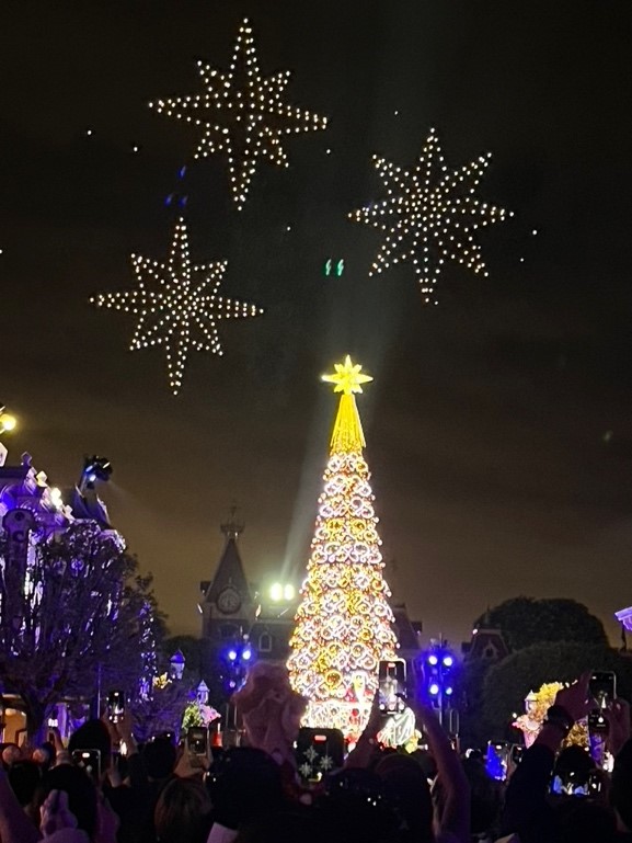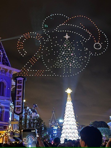 暗くなってきたら、メインストリートUSAで開催される、ツリーの点灯式に行きましょう。サンタ・グーフィーと聖歌隊が送るこちらのセレモニーは、ツリーの輝きも美しいですが、その背後の大空を飾るドローンがまた、素晴らしくかわいいんです!