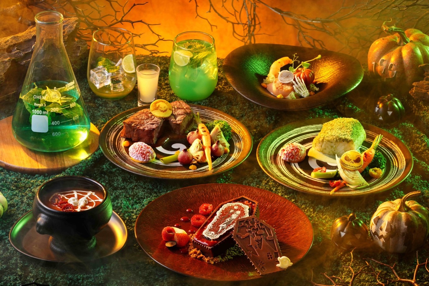 その後、ハロウィーンデコレーションで飾られたテーブルの上では、「吸血鬼の血のビスク」や「恐怖海鮮」などといった食事や、棺の形をしたデザートなど、ダークで愉快なディナーが楽しめます。
