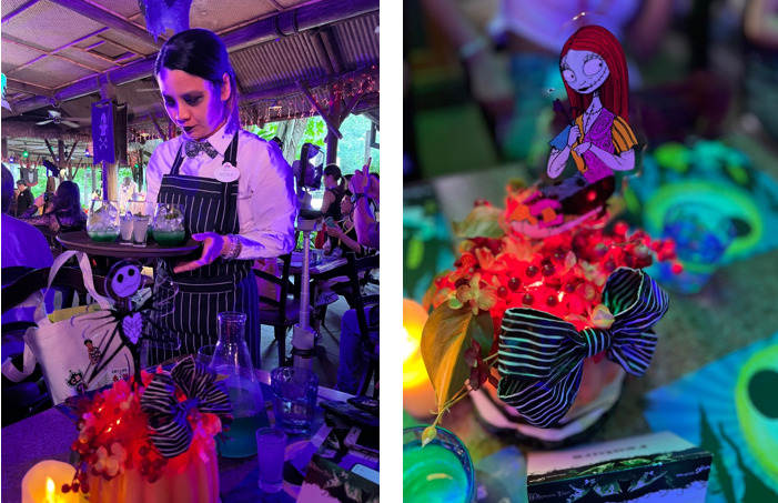 席に着くと、ハロウィンタウンから来たジャックの不気味な仲間が、「ウギー・ブギー・ボヒート」という、実験用ビーカーに入った、緑色に光る怪しげなウェルカムドリンクを持ってきてくれます。これを一口飲むと……あなたもハロウィンタウンの住民に!!