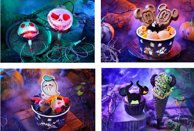 左上、Glowing Blood Bag Special Drinkは、まるでスケルトンの顔をした点滴バッグから、血を吸うかのようなドリンクで、若者たちが大はしゃぎながら飲んでいました。右上は、Halloween Waffle Basket。ハロウィーンカラーを基調とした、ミッキーとミニーのかわいらしさ溢れるワッフルです。左下はMagical Halloween Italian Gelato Basket。ジェラートのデコレーションにニョロニョロとした虫のようなグミキャンディが乗って、雰囲気を盛り上げてくれます。右下は、Maleficent Blackcurrant Cupcake + Pistachio Flavored Soft Serve。インスタ映え、間違いなしの邪悪なカップケーキとソフトクリームです。これらは、屋外の売店で販売されています。