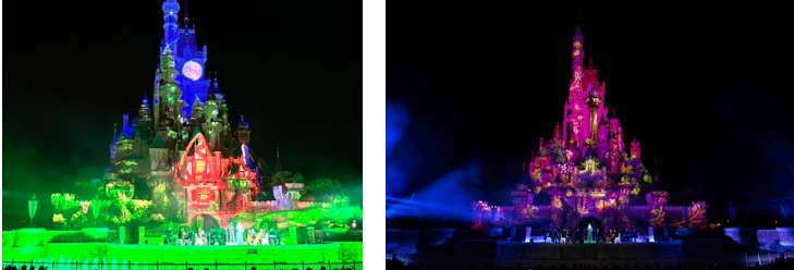 『眠れる森の美女』では美しいお城、『塔の上のラプンツェル』では姫が囚われている高い塔が映し出され、『モアナ』では、南の島の海を思わせるエメラルドブルーに変わり、噴水が上る……。