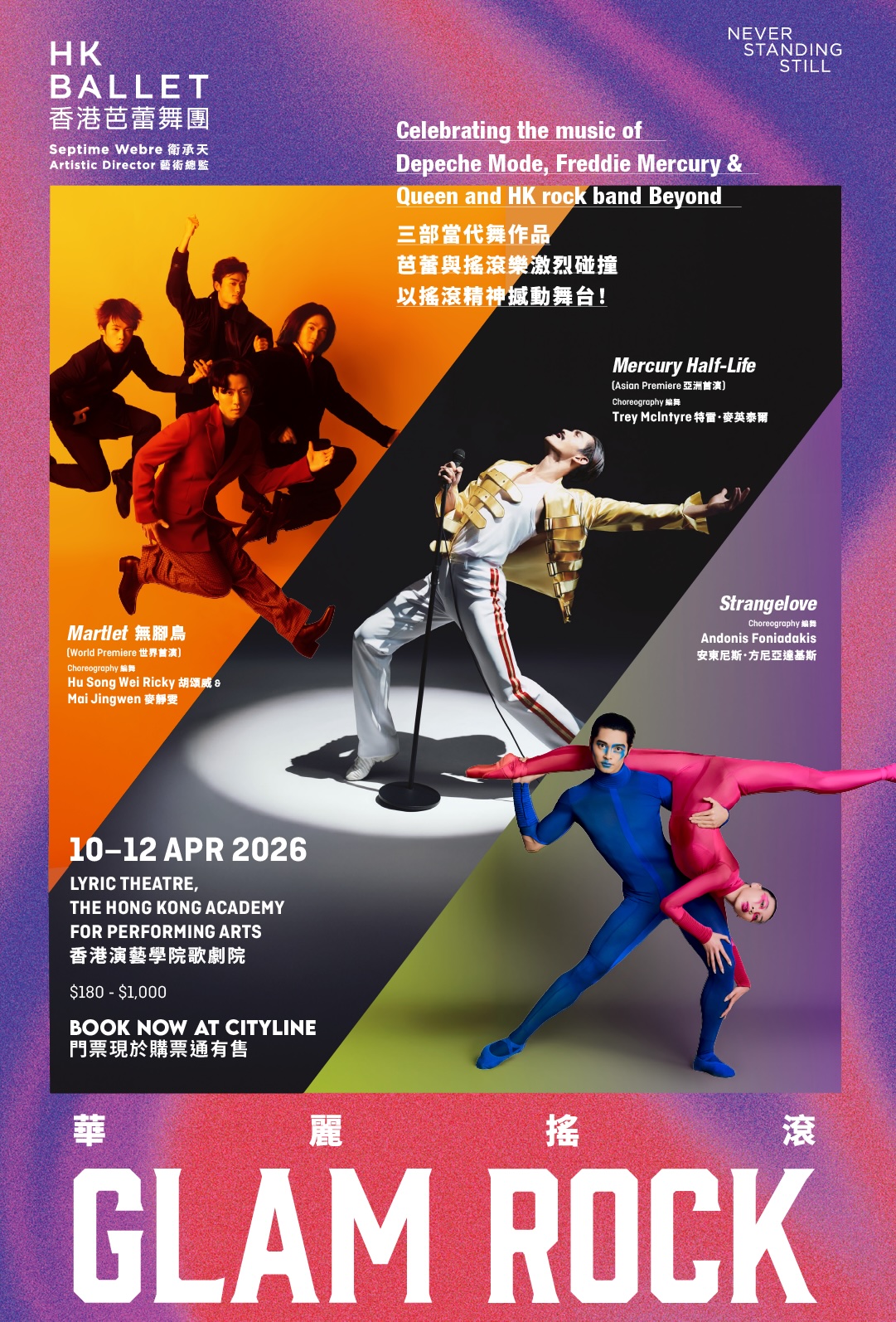 香港バレエ団がこの春お届けするのは、クラシックの枠を超えた挑戦的な舞台「Glam Rock」。4月10日から12日まで香港演藝學院歌劇院で上演されます。本公演は、バレエとロックが激しくぶつかり合う三部構成の作品で、世界的に活躍する三人の振付家が手掛けました。作品は、80年代のイギリス発のシンセポップから90年代香港の伝説的ロックまで、時代と国境を越えて火花を散らします。香港の伝説的ロックは香港の音楽史に燦然と輝くBeyondへのオマージュ作品で、世界初公開されます。