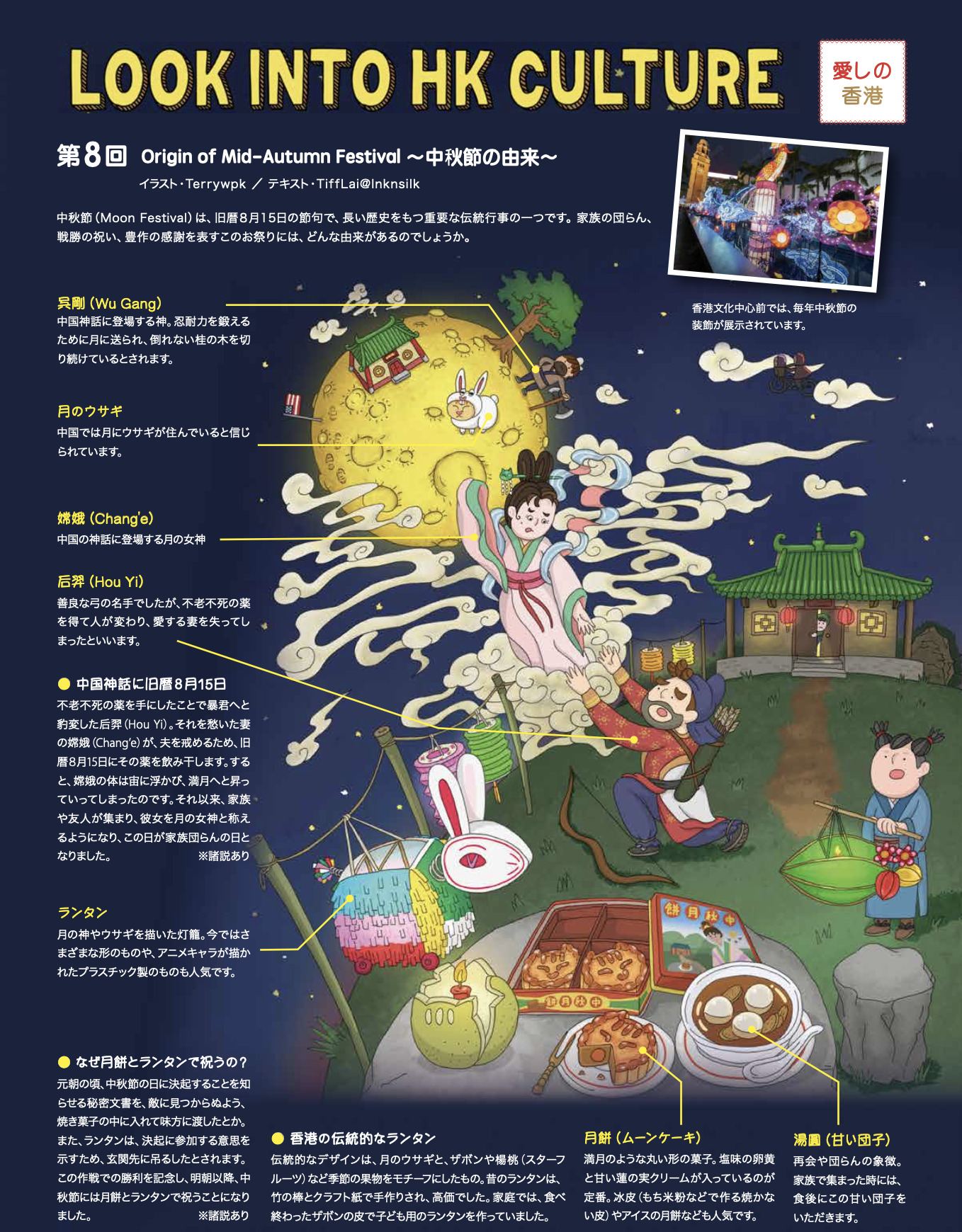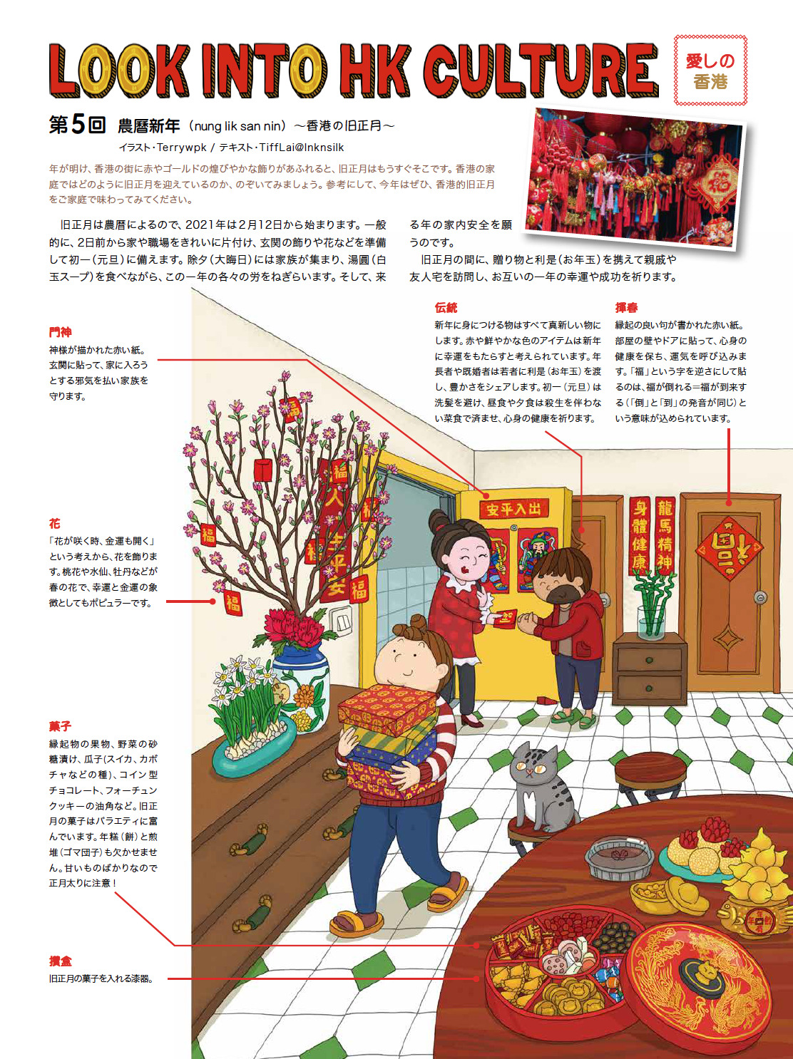 一年の中でもっとも大きなイベント。街は赤と金の装飾で華やかに彩られ、年宵花市(フラワーマーケット)ナイトパレード、ビクトリアハーバーの花火など、さまざまな催しが行われます。家族で集まり、縁起物の料理やお菓子を楽しむのもこの時期ならではです。旧正月の日程は、農暦なので年によって1月だったり2月だったりします。旧正月の香港家庭の様子は、以下の「LOOK INTO HK CULTURE」(イラスト・Terrywpk/テキスト・TiffLai@Inknsilk)の記事でご覧いただけます(画像をクリックすると記事へ飛びます)。
