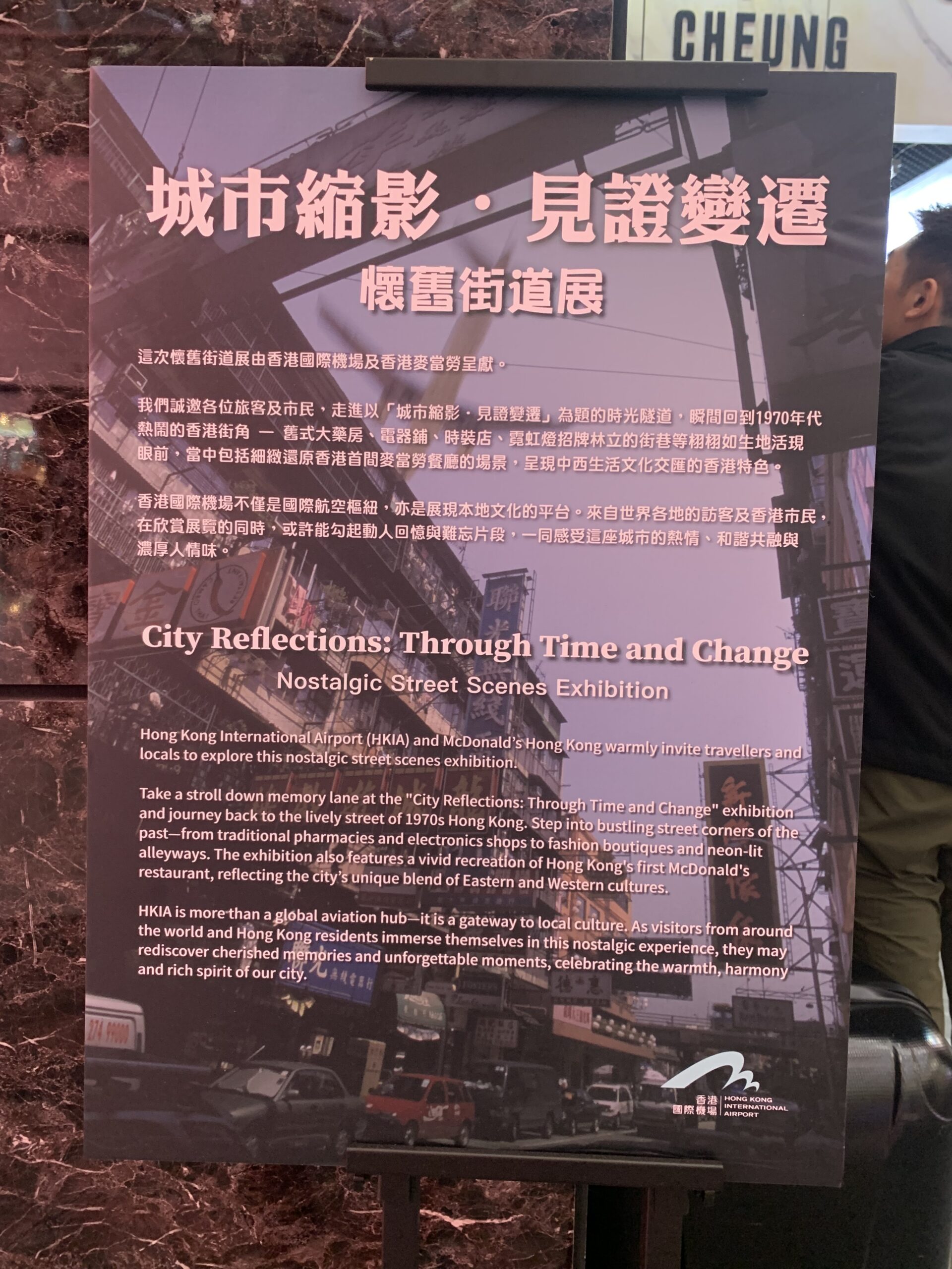 香港国際空港の到着ロビーで開催されている香港の1970年代懐かしいショップストリート。テイラーメイドの衣料店や、薬局、電化製品、ネオンコーナー、そしてこの展示の主催者でもあるマクドナルドの香港第一号店を再現したショップまであります。シェイクが2ドル!という発見もあり!ぜひ立ち寄ってみてくださいね。