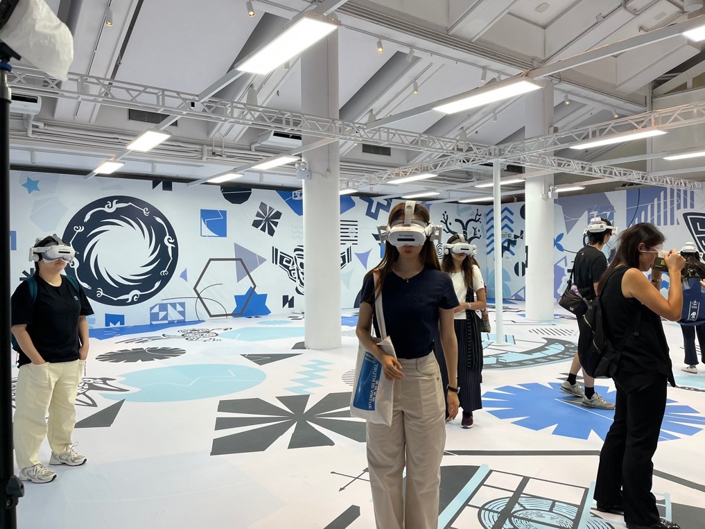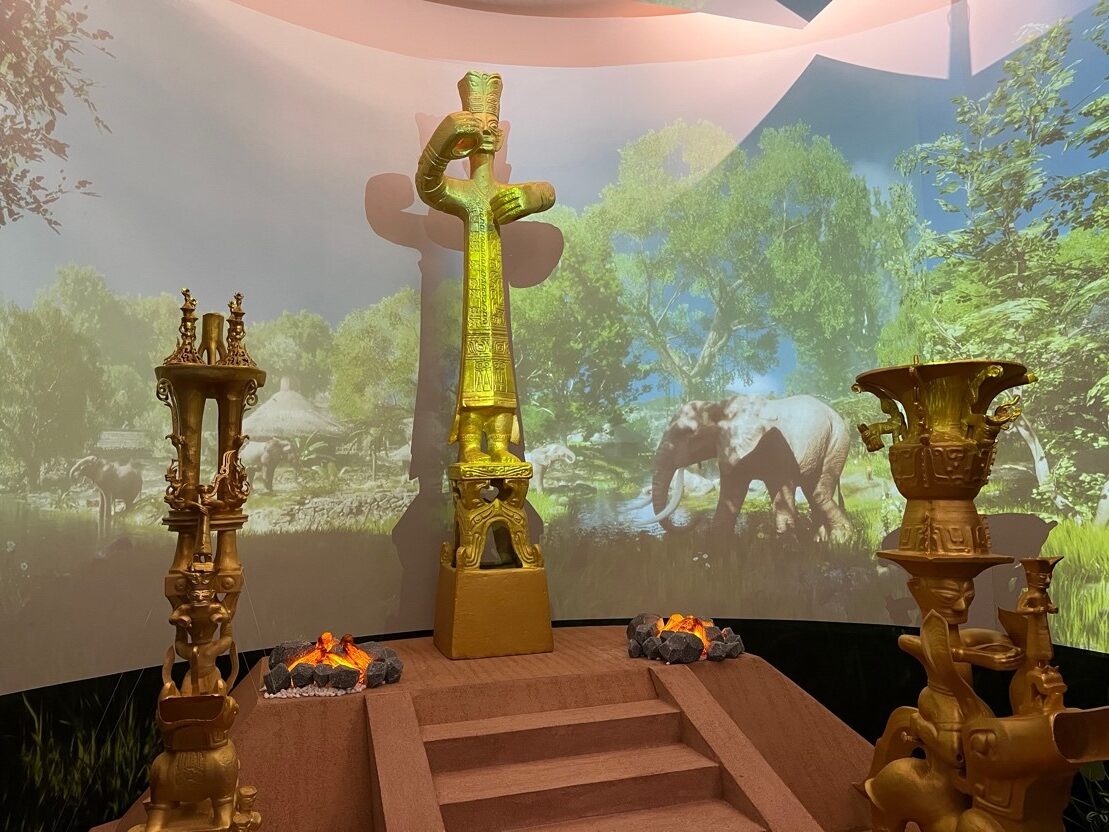 VRマスクをつけると、あら、不思議。どこでもドアをくぐったかのように、三星堆遺跡が目の前に広がります。前に進んでも、上を向いても、横を向いても、そこは三星堆遺跡! 一瞬、展示の話は忘れて、「VRってすごくない!?」とうっとりします。