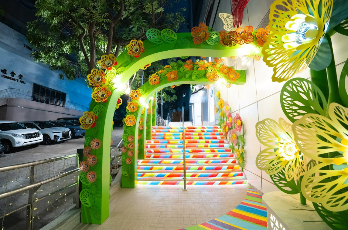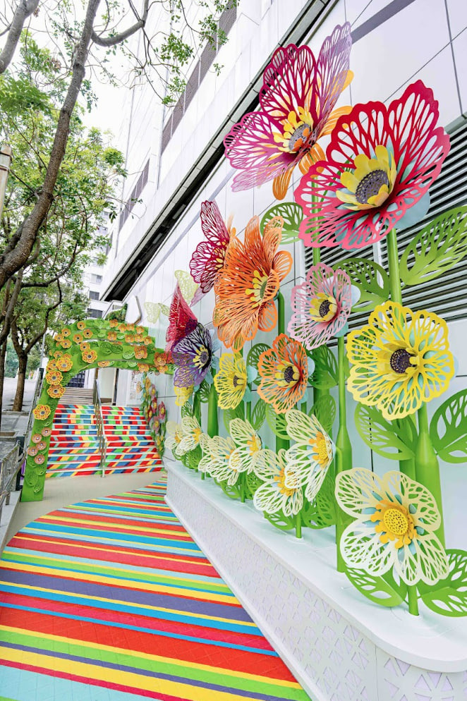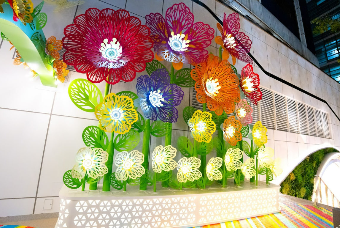 今回の作品は香港のスタッフとの共同作業でした。作品の色合いがミラ・プレイスのイメージカラーを反映していたりと、自分の作品でありながら、新たな角度の表現ができ、とても嬉しく思っています。また、ここにある大きな花は、昼と夜で全く異なる見え方になるようデザインしています。夜にライトアップした時に影が幻想的な効果を生み出すので、是非、夜にも鑑賞してみてください。