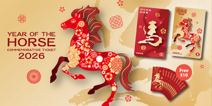 旧正月記念券のデザイン(写真上)が、銅鑼湾、尖沙咀、太和の各駅の改札や競馬場の入場口などを装飾します。伝統的な切り紙の模様や風車の飾りの図柄で風が流れることで、幸運の流れを取り込むことを表しています。この改札を通ると運気が上がるかもしれませんよ(笑)。