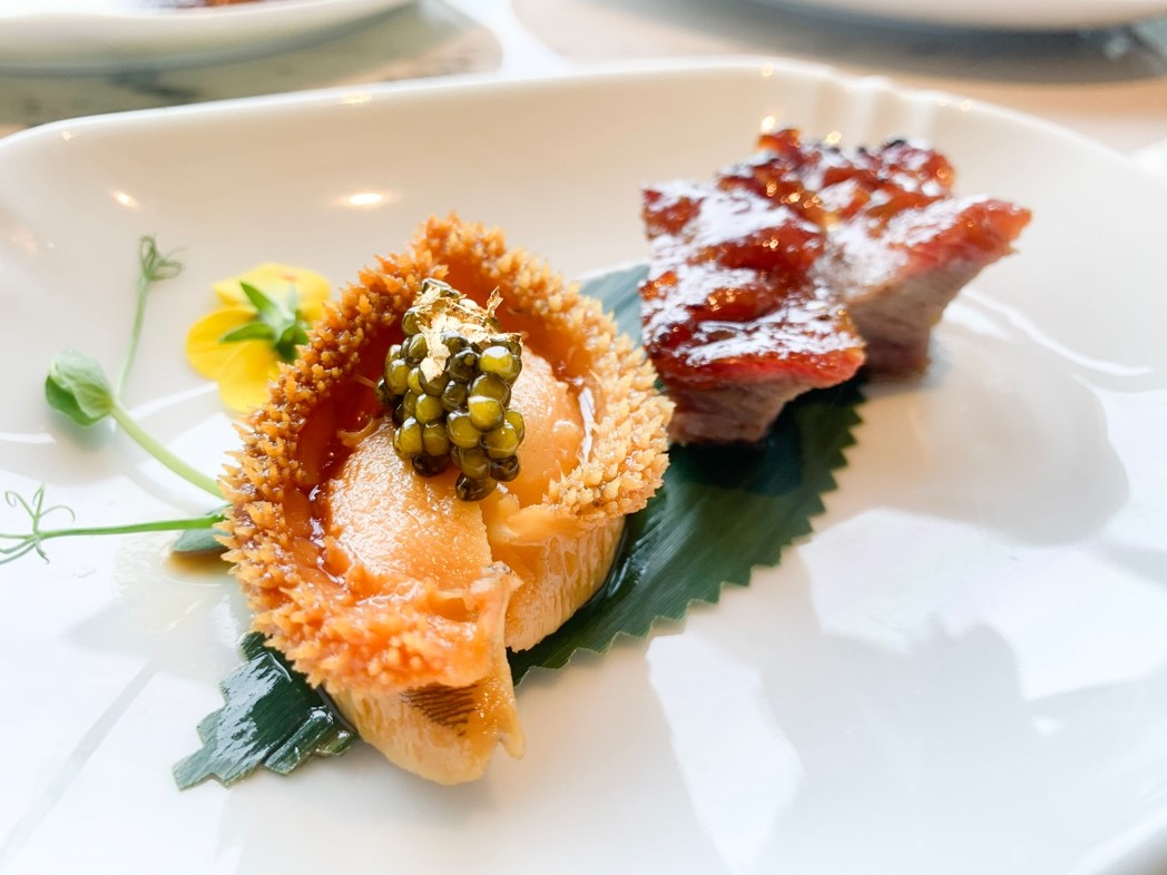 キャビアの乗ったアワビ「魚子醬花雕冰鎮鮮鮑魚(Chilled Drunken Abalone, Beluga Caviar)」とチャーシュー「蜜汁叉燒皇(Honey Glazed Barbecued Pork)」©Hong Kong LEI