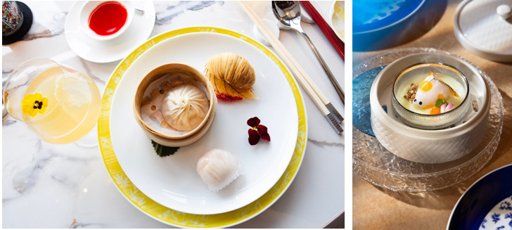 また、写真右も点心の一品なのですが、まるで金魚が泳いでいるかのよう! この芸術的な点心は「星斑金魚餃」と言い、ハタ系の魚と卵の白身が使われています。胃袋に収める前に、ぜひ、カメラにこの芸術品を撮り収めてくださいね。