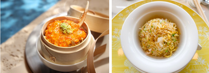 写真左:カニ、カニのたまご、ホタテ干し貝柱チャーハン「紅蟳米香(Crab Fried Rice, Crab Roe, Conpoy, Chicken, Duck, Mushroom)」©Hyatt Centric Victoria Harbour Hong Kong