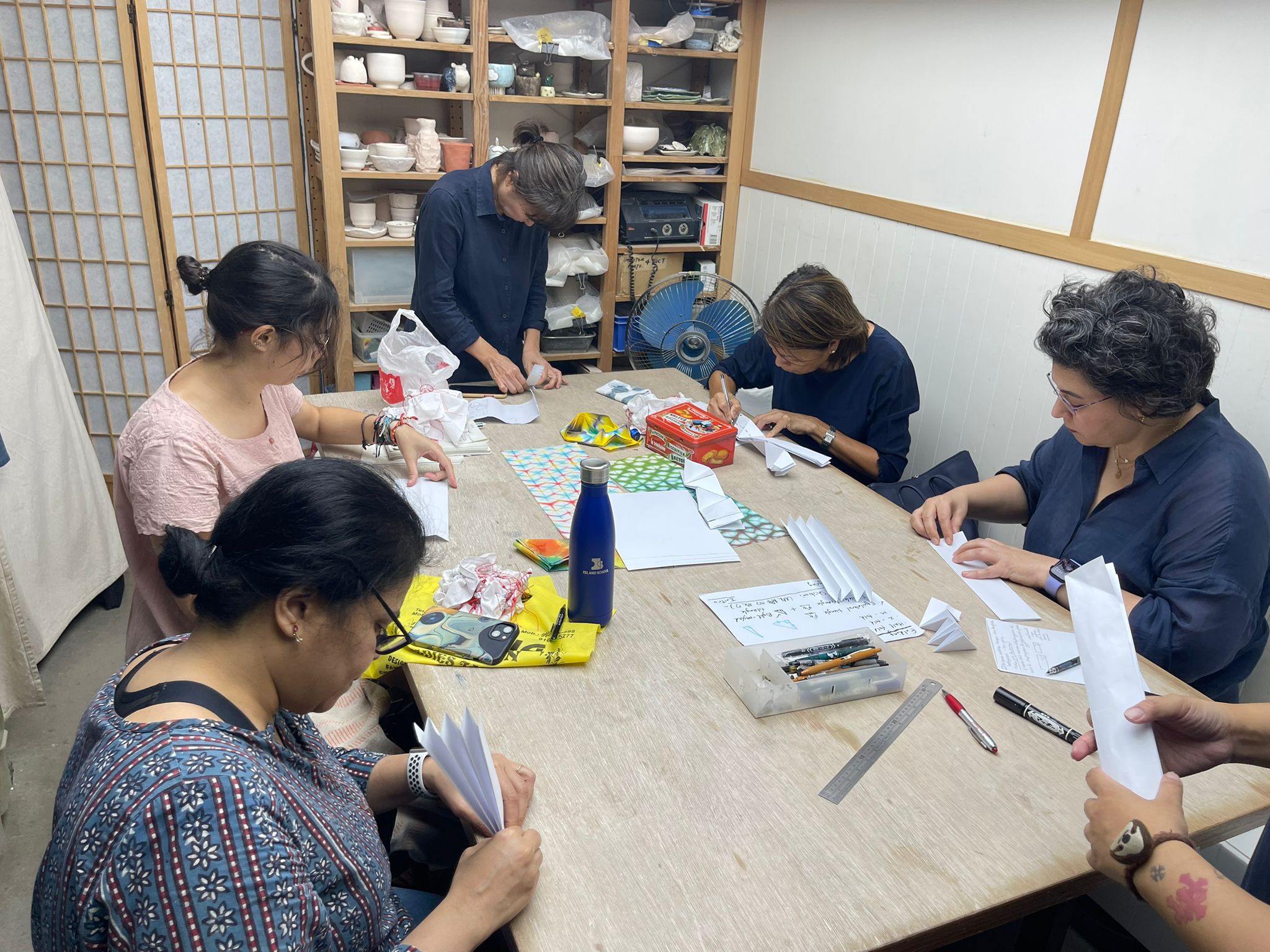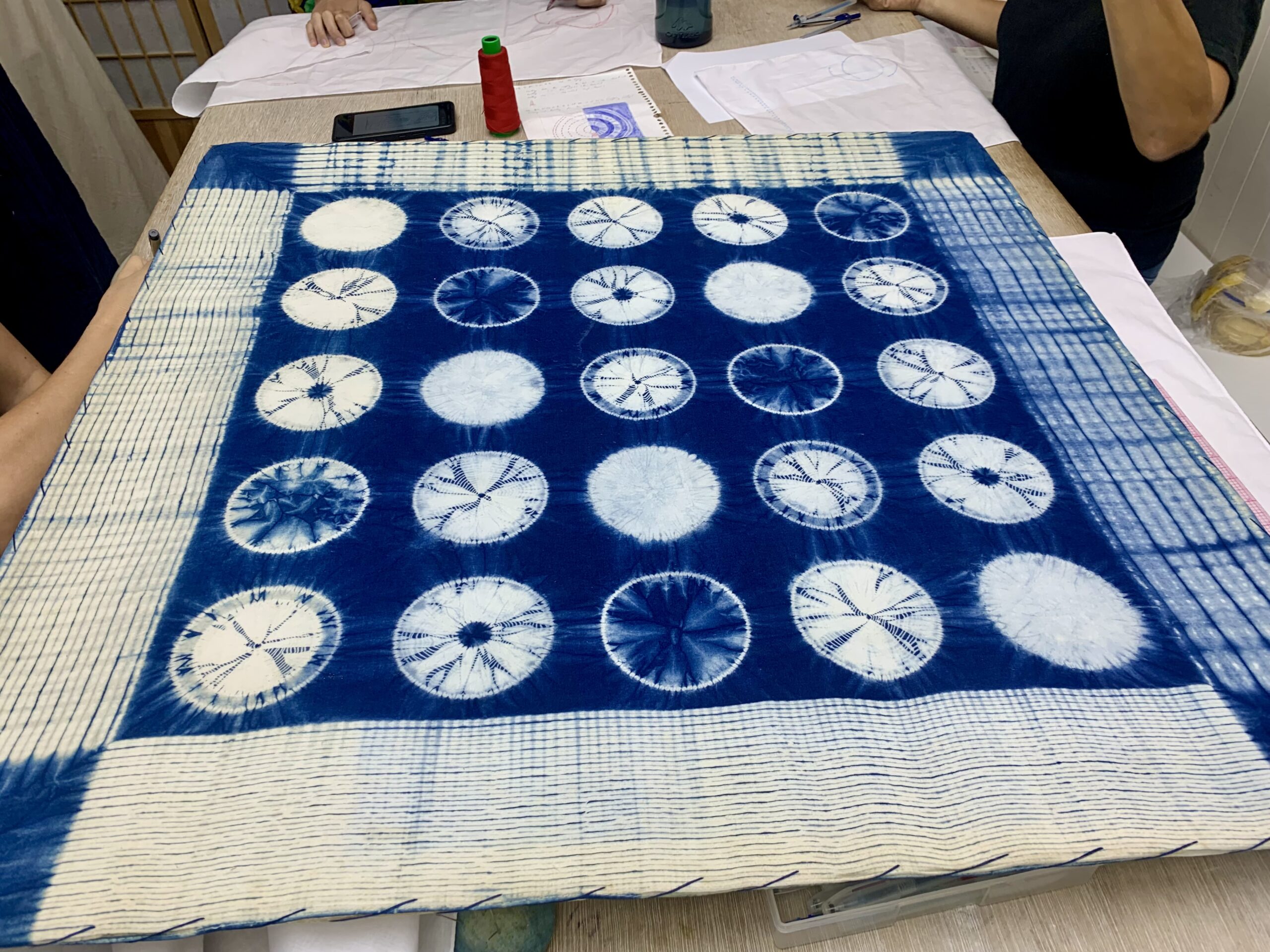 今回、1回4時間のクラスを4回、合計16時間を共有した先生とクラスメート。できた作品を皆で鑑賞する時間も創作クラスの醍醐味です。香港で体験するしぼりクラスはとても新鮮で大変貴重な経験でした。