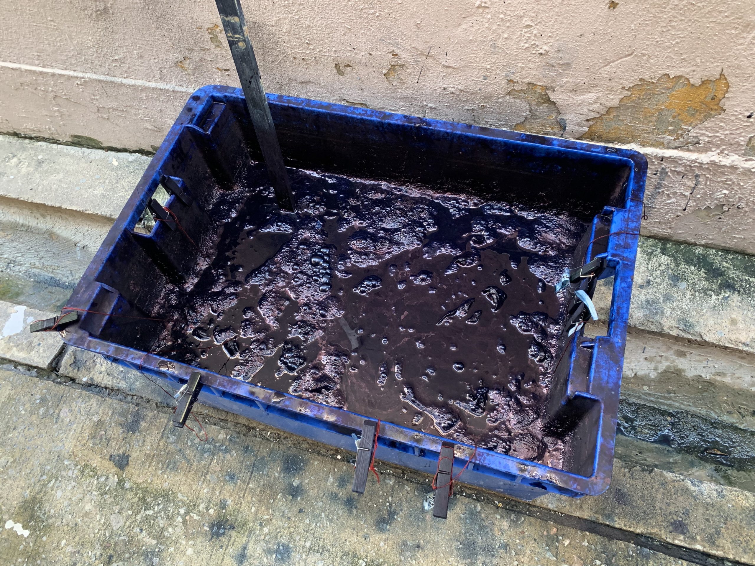 ぶくぶくしているのが藍が生きて発酵しているサイン。染液はEricさんの調合によるもの。