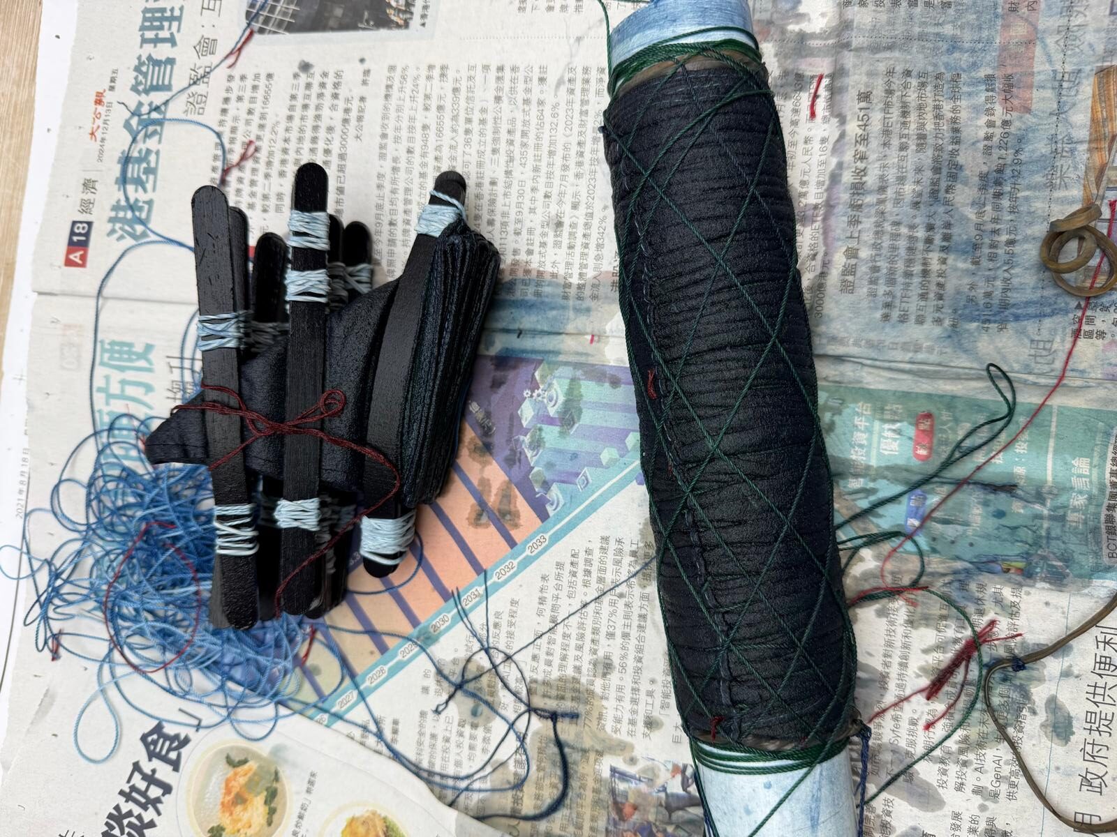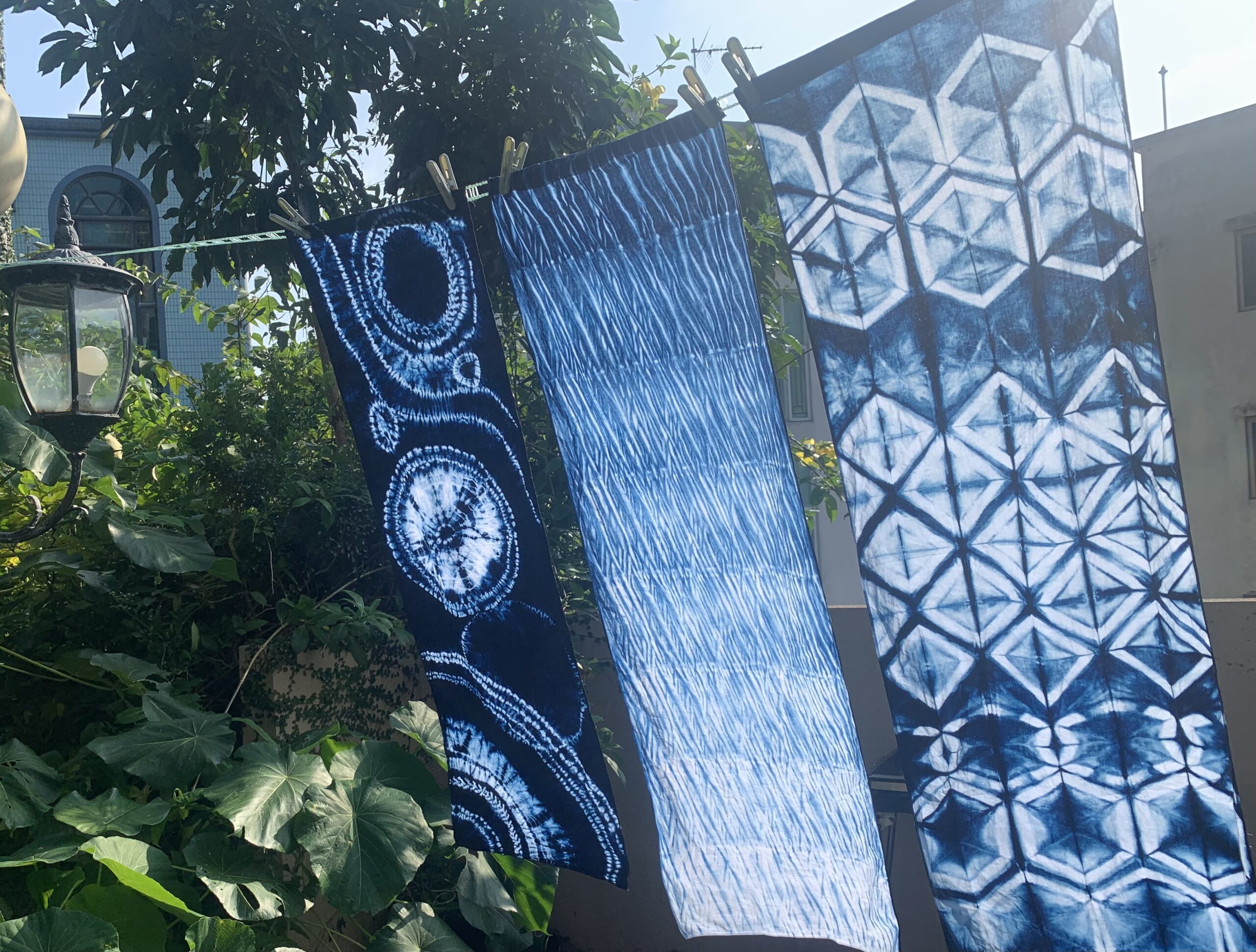 ちなみに最後に染め上がった作品は、自宅に持ち帰り、塩と酢に漬け込んだ後に水洗いし、色が落ち着いたら乾かします。さまざまな染め方を習ったので、その課題を応用して作ったものがこちら(写真下)。乾くとほのかに藍染の良い香りがします。今後は手拭いとして使う予定です。