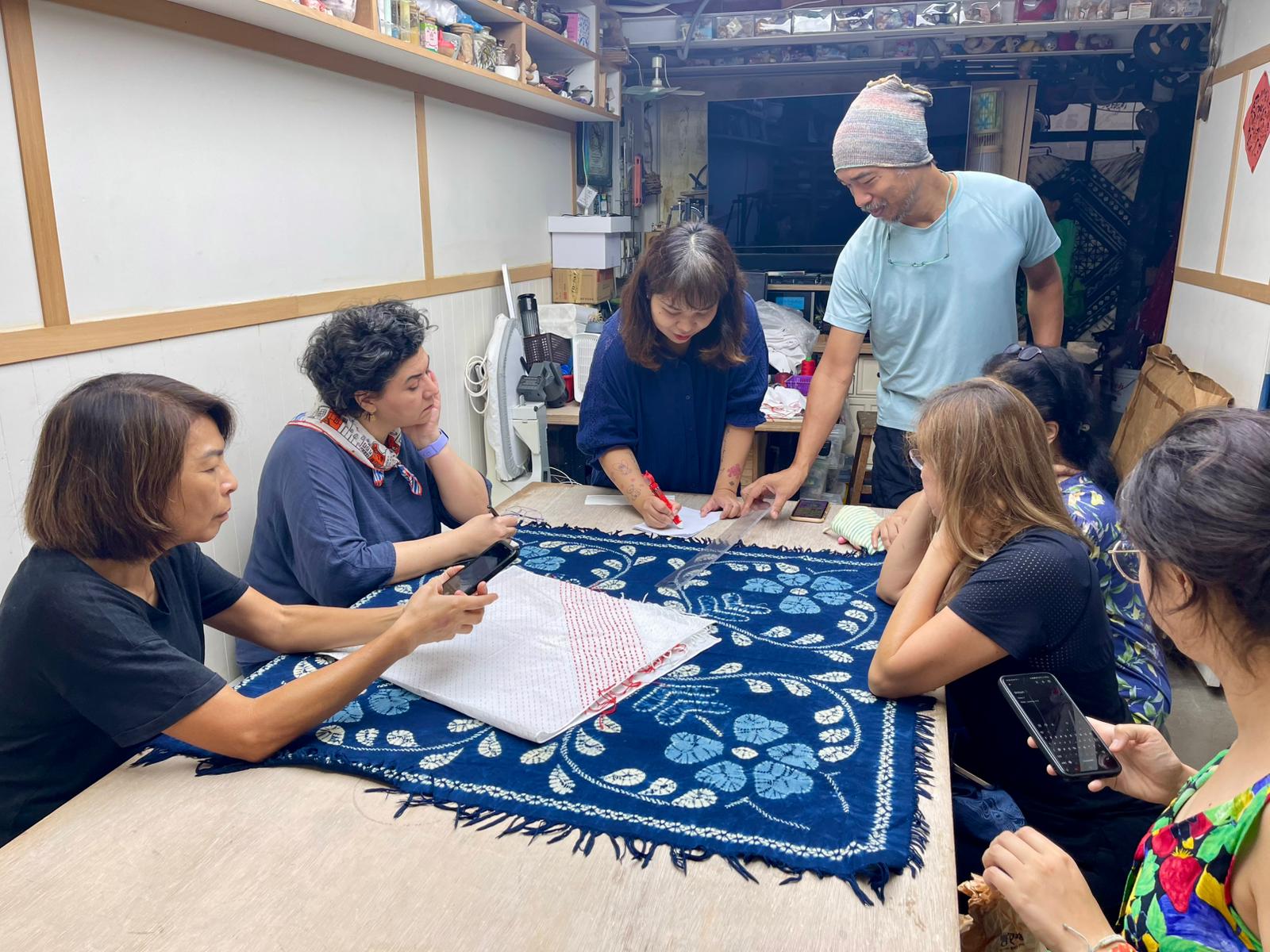 さて、香港でしぼりを使った藍染の啓蒙活動を務める主催者のひとりで、藍染研究家のエリックさんが、藍染に魅せられたのは小学生の頃だそうで、両親が雲南旅行から持ち帰った布を見たときだそうです。その美しさに魅了されてからというもの、この昔からある藍染について、古代中国の文献や日本の書籍、オンライン上でのあらゆる情報を通して、技術をはじめ、視点、解釈などを独学で学びました。古代技法の詳細な分析を行い、自身でかみくだいた方法を、よりアクセスしやすく理解しやすい形で、ワークショップの参加者に教えています。また、日本で開催するしぼりワークショップを通して、日本の職人と親睦を図るなど意欲的に文化交流の活動もしています。