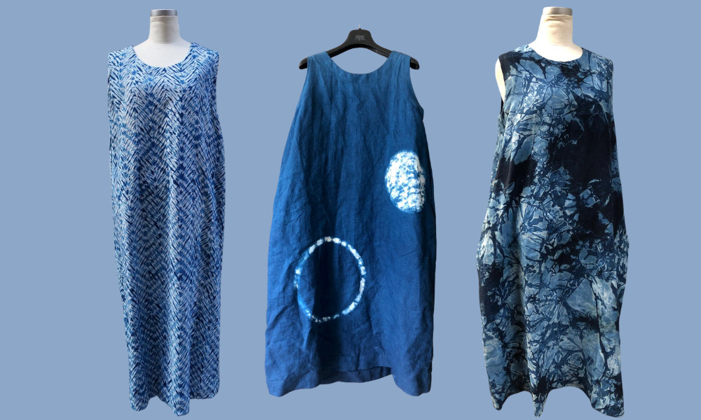 ワンピースは、エリックさんが染めたものから仕立てたもの。染めた布で、バックやのれん、シャツなどを作ることもできます。