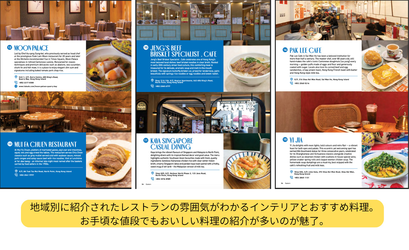 グルメガイドブックは、香港政府観光局と中華厨芸学院(CCI)と共同開発しました。中華厨芸学院(CCI)のマスターシェフコースを修了した50人以上の香港を代表する名だたるマスターシェフたちが、その視点と味覚を使って、香港全域から250軒ものレストランを厳選しています。伝統的な麺料理店や老舗の甘味処、家族経営のローカル店、こだわりのカフェ、高級ホテルのレストラン、ミシュラン星付きのファインダイニングまで、多岐にわたるジャンルを網羅しています。